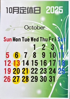 10月 定休日 2025/09/30 10月の定休日は、 10月6日、13日、20日、21日、27日、28日 になります。 店長不在日は、8日(水),12日(日)午後になります。 よろしくお願いします。