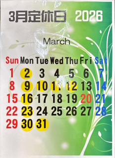 3月 定休日 2026/02/16 3月の定休日は、 3月2日、9日、10日、11日,12日、16日、23日、30日、31日 になります。 店長不在日は、12日(木)、13日(金)、24日(火)になります。 よろしくお願いします。 お知らせ